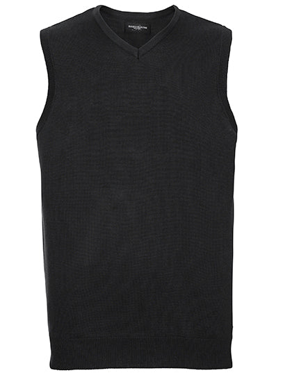Die ärmellose Version des klassischen Russell-Pullovers mit V-Ausschnitt – perfekt mit Hemd oder T-Shirt kombinierbar.